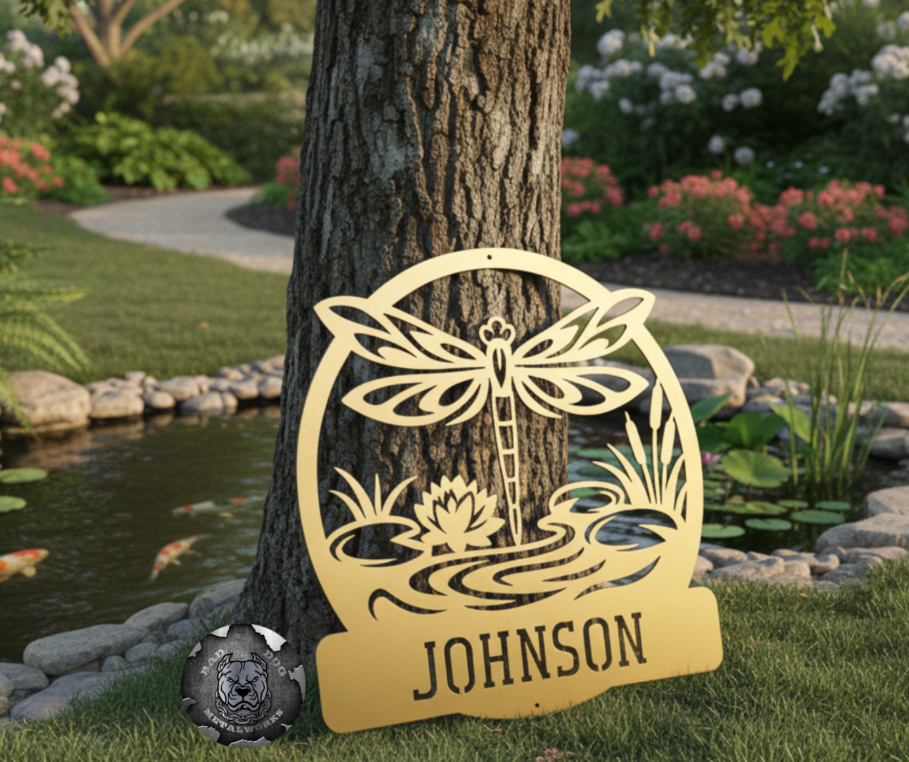 Inspired by peaceful pond scenes and the timeless symbolism of the dragonfly, this design features flowing water, cattails, a lotus, and a bold dragonfly centerpiece—finished with a personalized name for a truly custom touch. It’s elegant without being delicate, and strong without being loud… just how we like it.