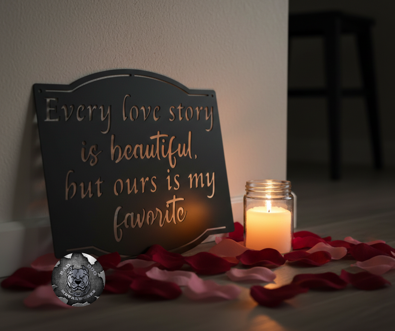 Want to be romantic, but don't want to sit through The Notebook? Let us help! Celebrate your one-of-a-kind love with this elegant and heartfelt metal sign from Bad Dog Metalworks. Featuring the timeless quote: