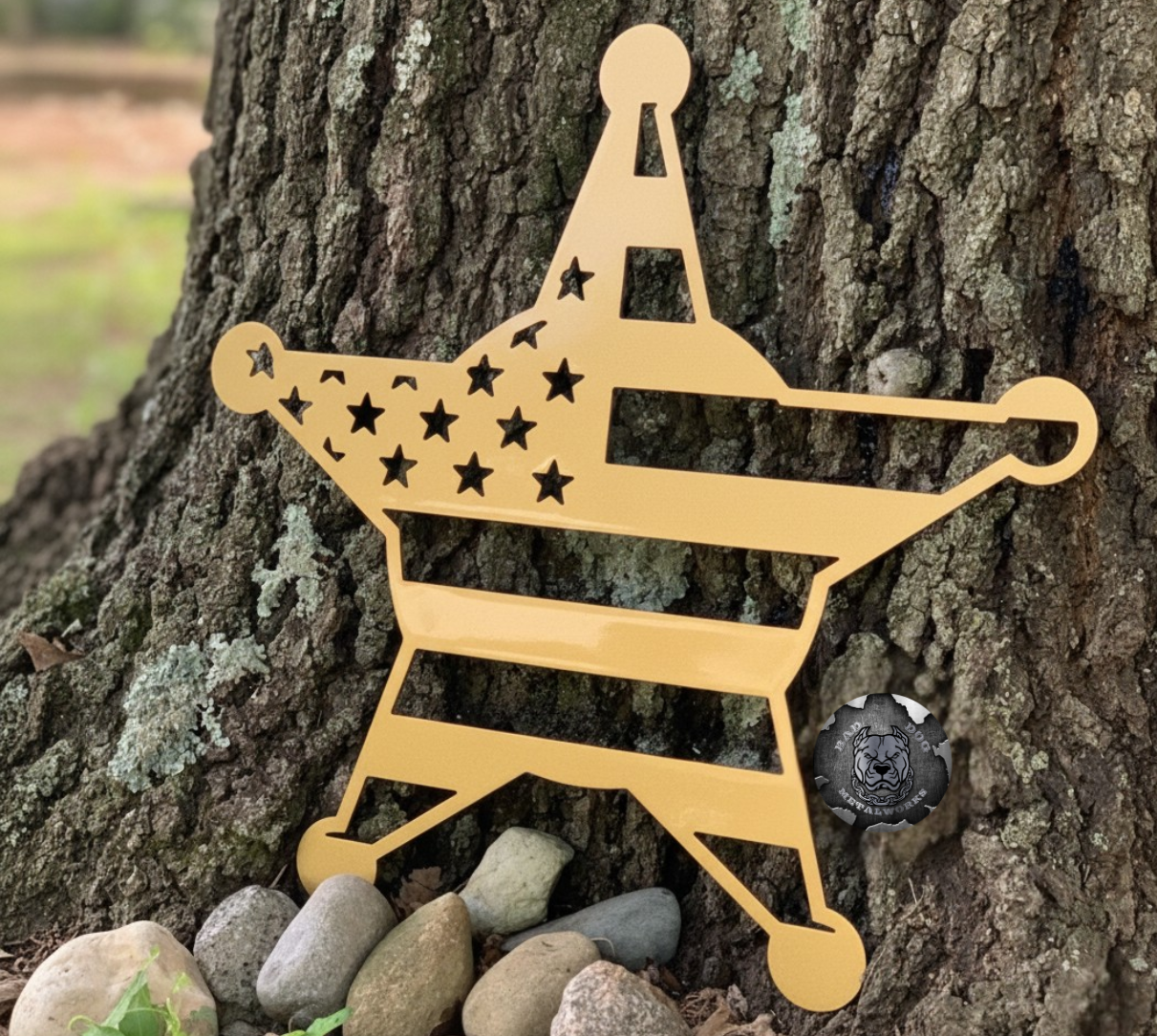 Bold stripes, bright stars, brave hearts. Bring bold western pride and patriotic flair to your home, ranch, or man cave with our Sheriff Star Badge Flag — a ruggedly handsome wall sign crafted by Bad Dog Metalworks.