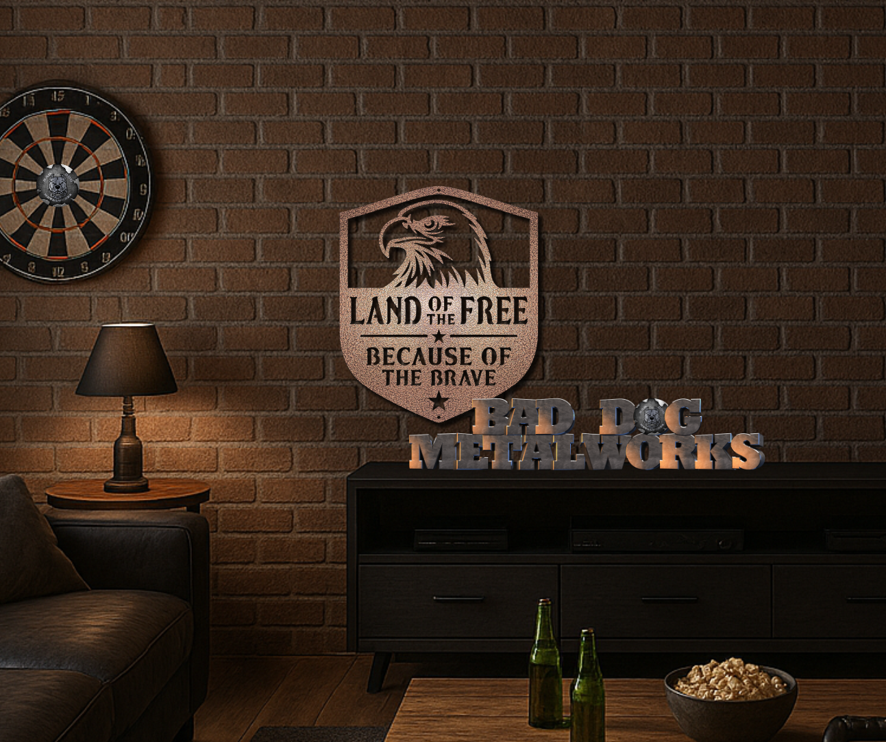 Celebrate the spirit of freedom with our Land of the Free Because of the Brave Eagle sign. This striking piece honors the courage and sacrifice of those who protect our nation, featuring a proud eagle symbolizing strength and liberty.