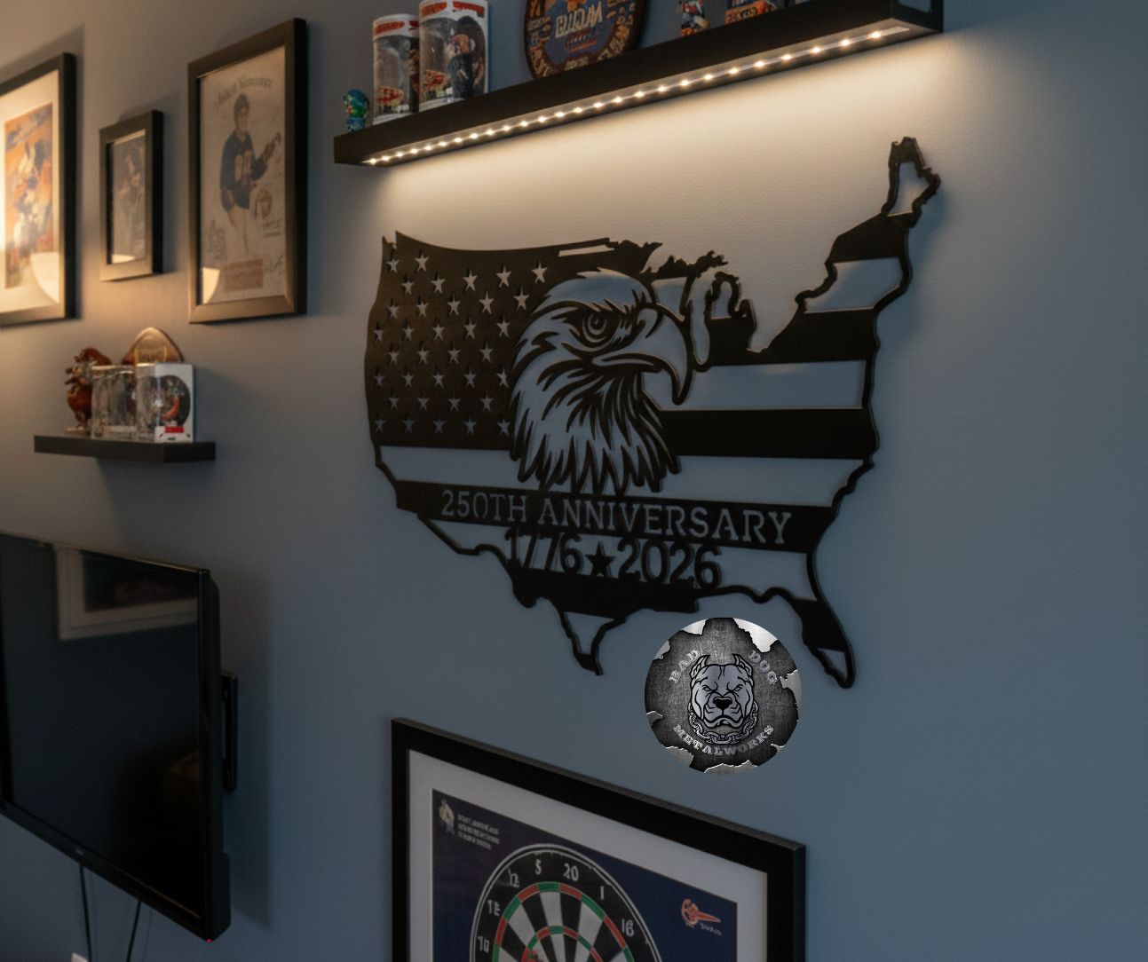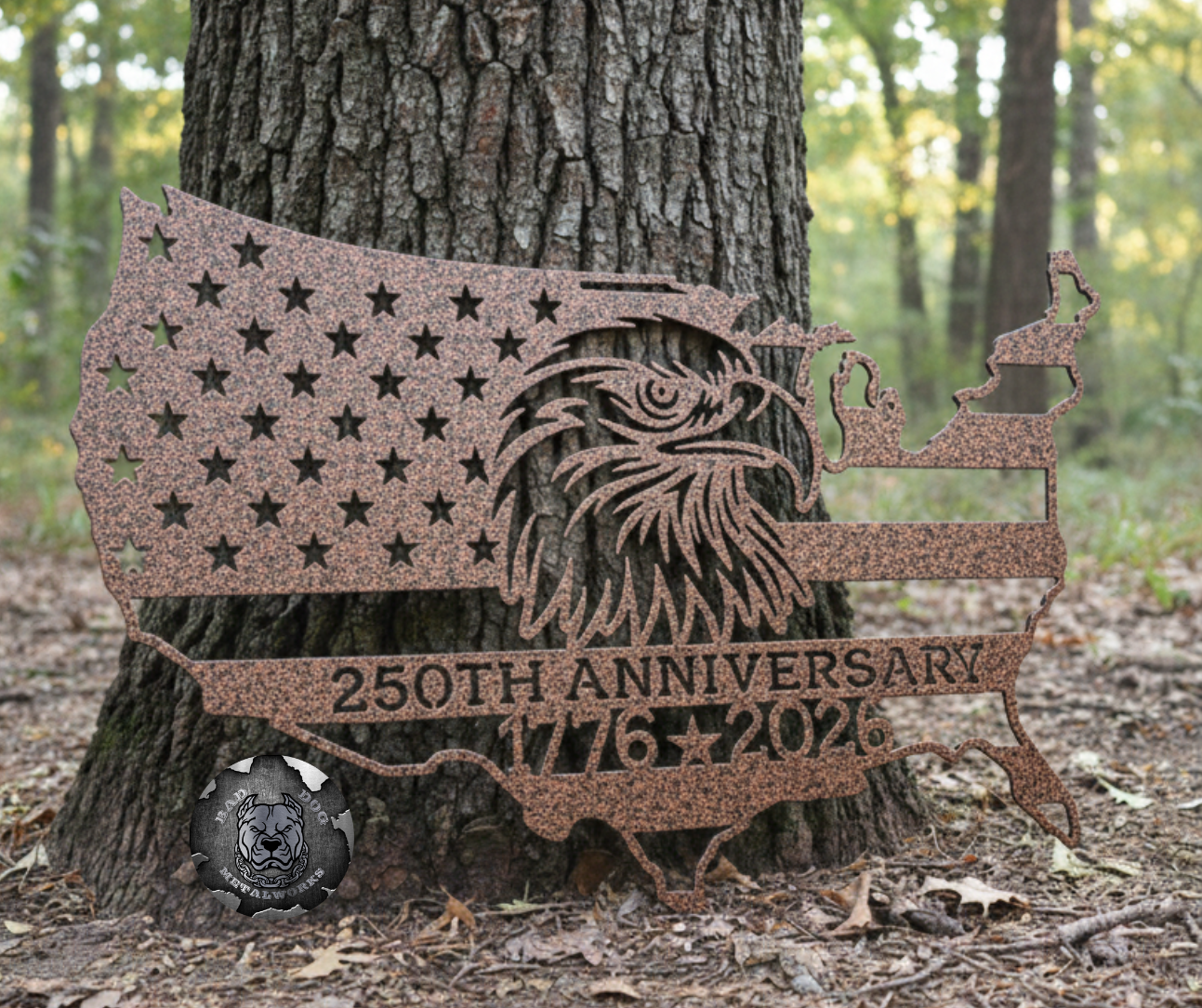 This USA 250th Anniversary metal sign from Bad Dog Metalworks features a powerful bald eagle overlayed on the American flag, cut into the unmistakable shape of the United States. Its commanding presence makes this piece a true tribute to the strength, sacrifice, and resilience that built this country.